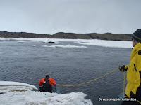 I managed to get onto a fishing/wading collection of marine life for the aquarium today and found it rather interesting to see the scientists with their dry-suits on and their child restraint harnesses. These were to stop them being swept away by the current and were held onto by their dive assistant. They collected a large number of sea urchins, a couple of starfish and a small fish along with a few other little critters. The tide crack is where I went fishing with my ice axe. It was very gently to collect sea urchins from the bottom without getting ridiculously cold. I do not have any photos of this as it was my head down the hole! We got there in the local taxi/ helicopter service (the public transport system takes you where ever you want to go down here). The other photo is of the sea ice edge as it is breaking off. These pieces break off each day with the rise and fall of the tide!